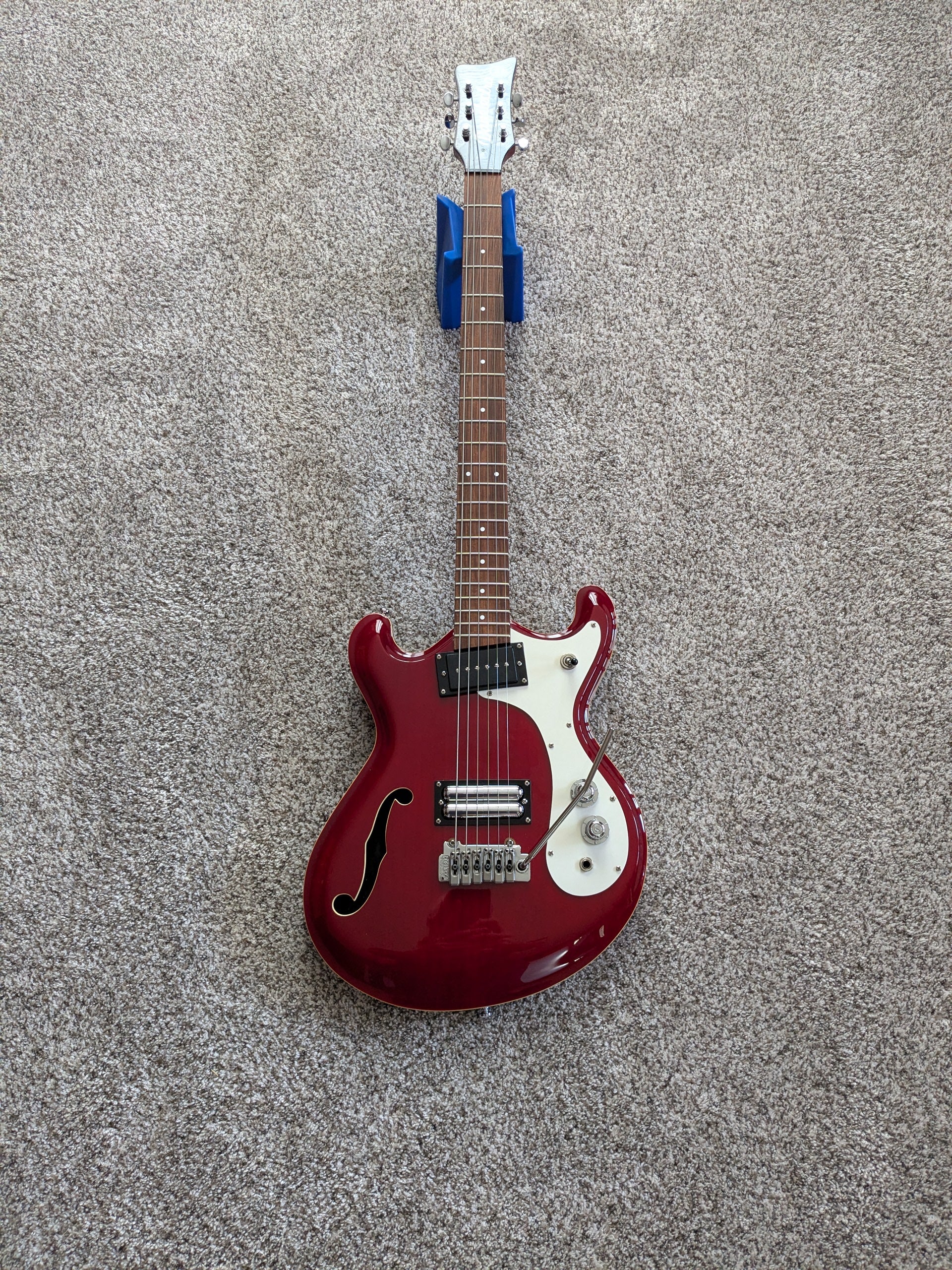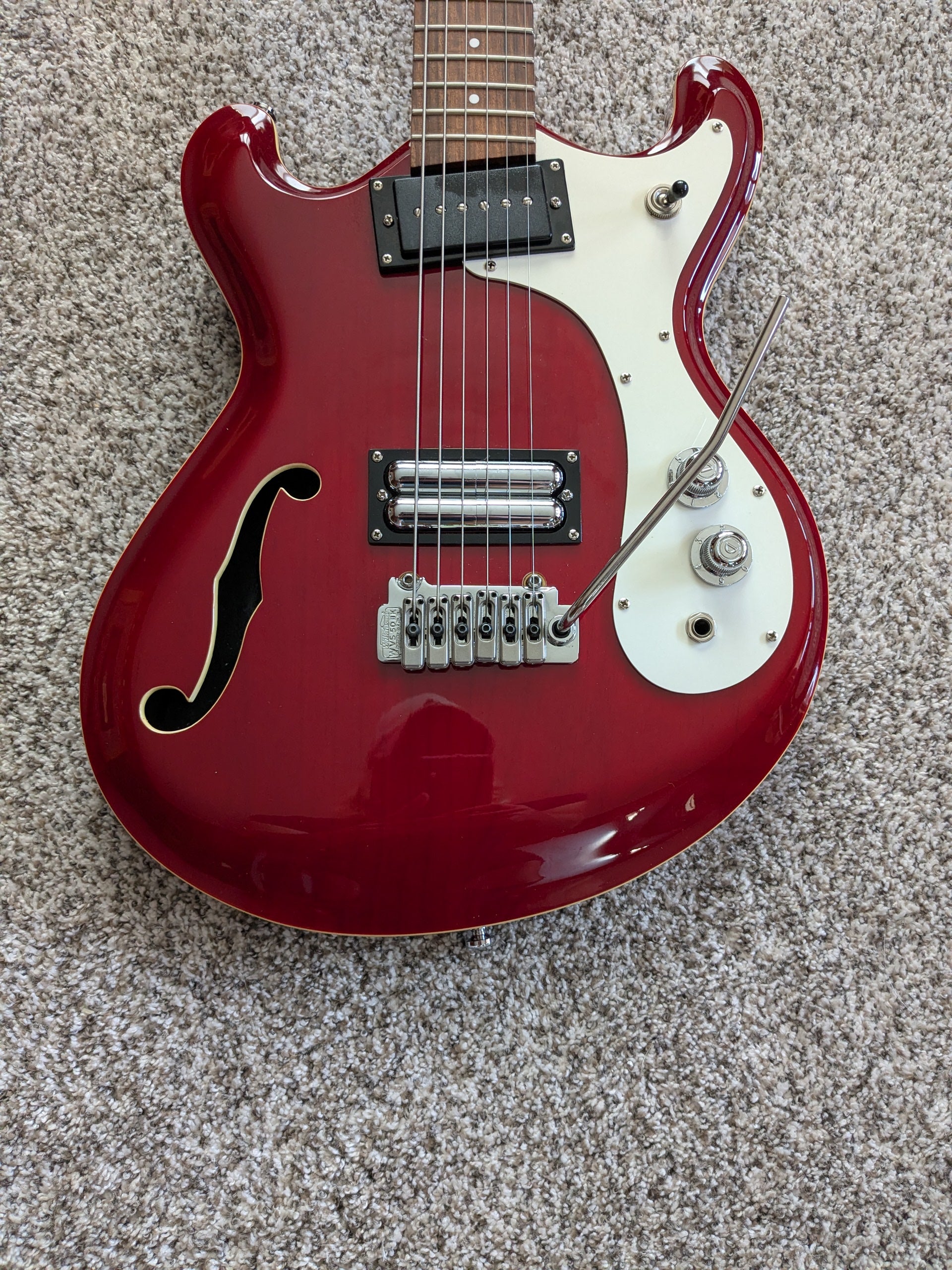 Danelectro The 66BT Baritone with Tremolo (2018) in Transparent Red. This unique semi-hollow baritone delivers the unmistakable Danelectro vibe with modern versatility. With its long 29.75" scale, it’s perfect for deep, rich baritone tones that still retain clarity and punch.