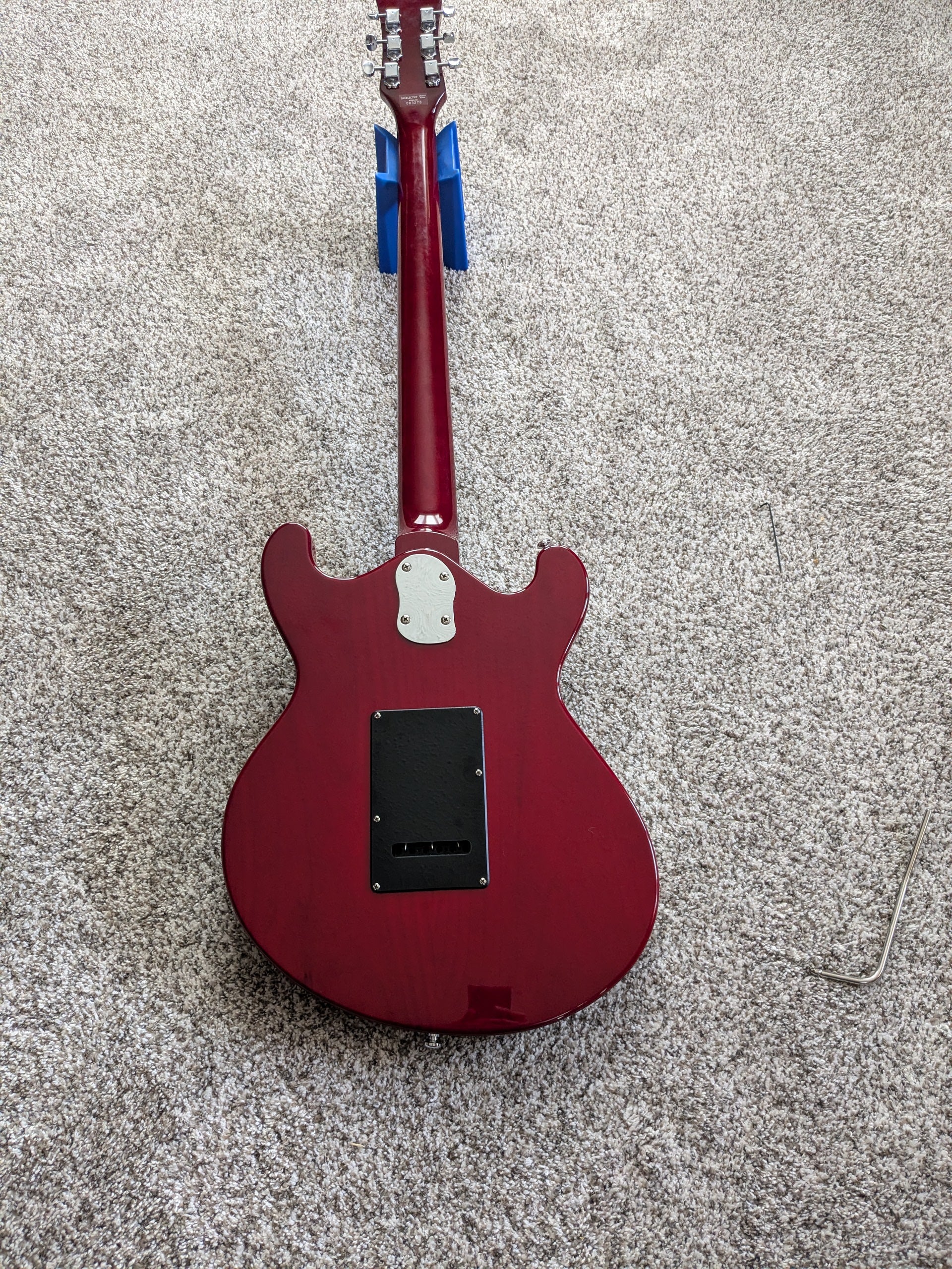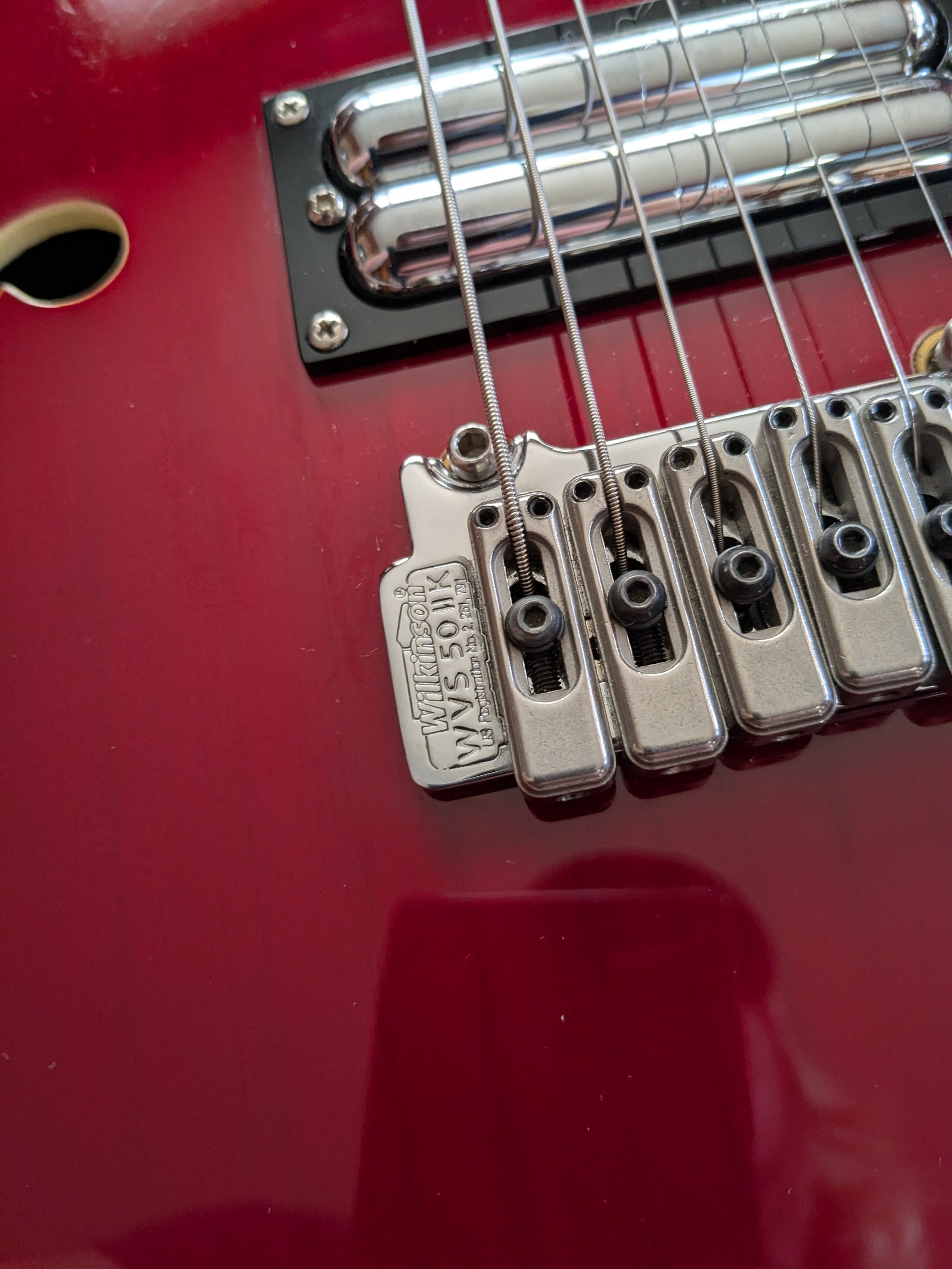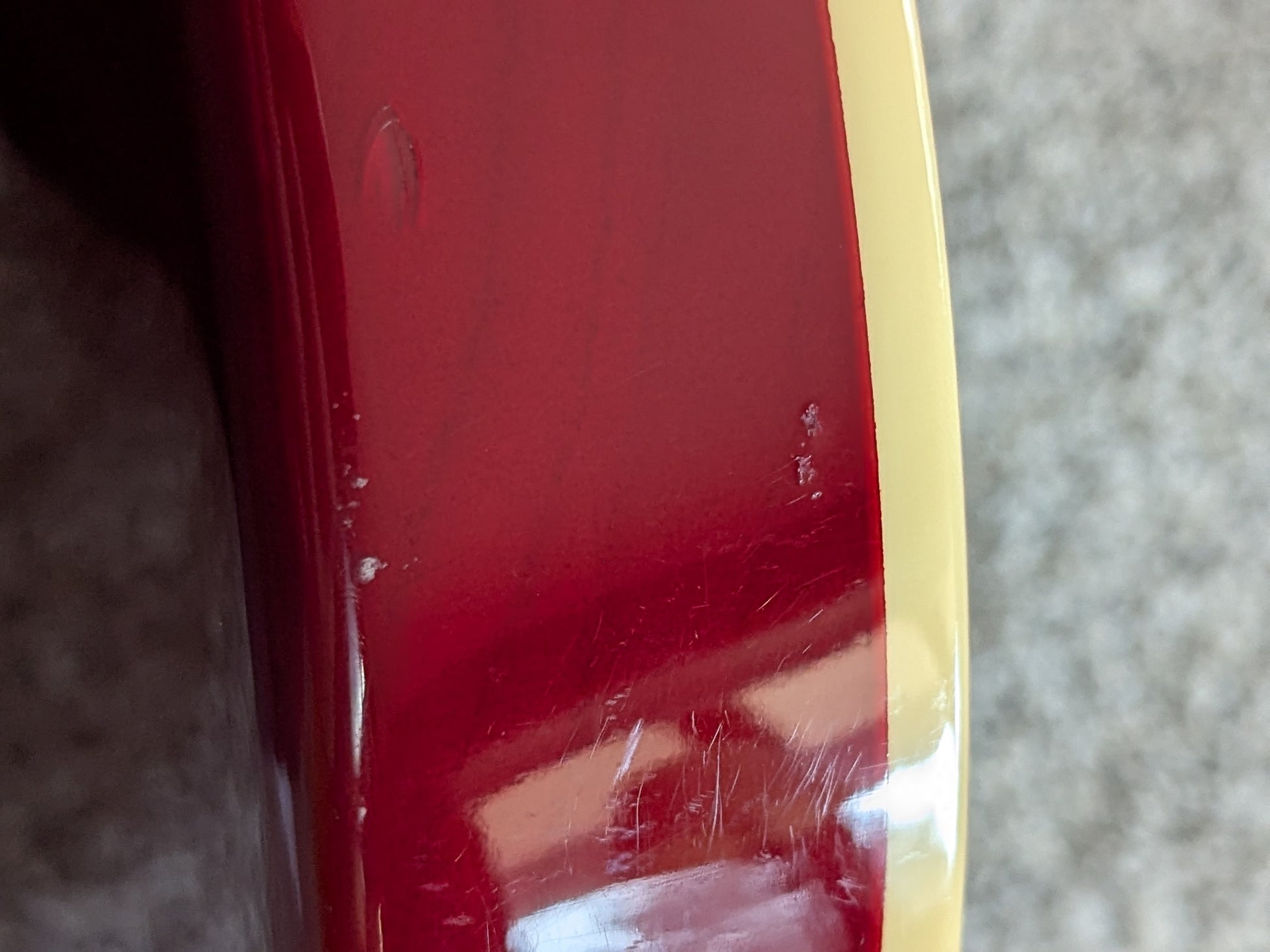 Condition: Very good overall. There are a few minor marks and nicks (pictured) but nothing affecting playability or tone. Tremolo arm is included; note that it requires an Allen wrench to tighten/lock (not included). Plays great and intonates well.