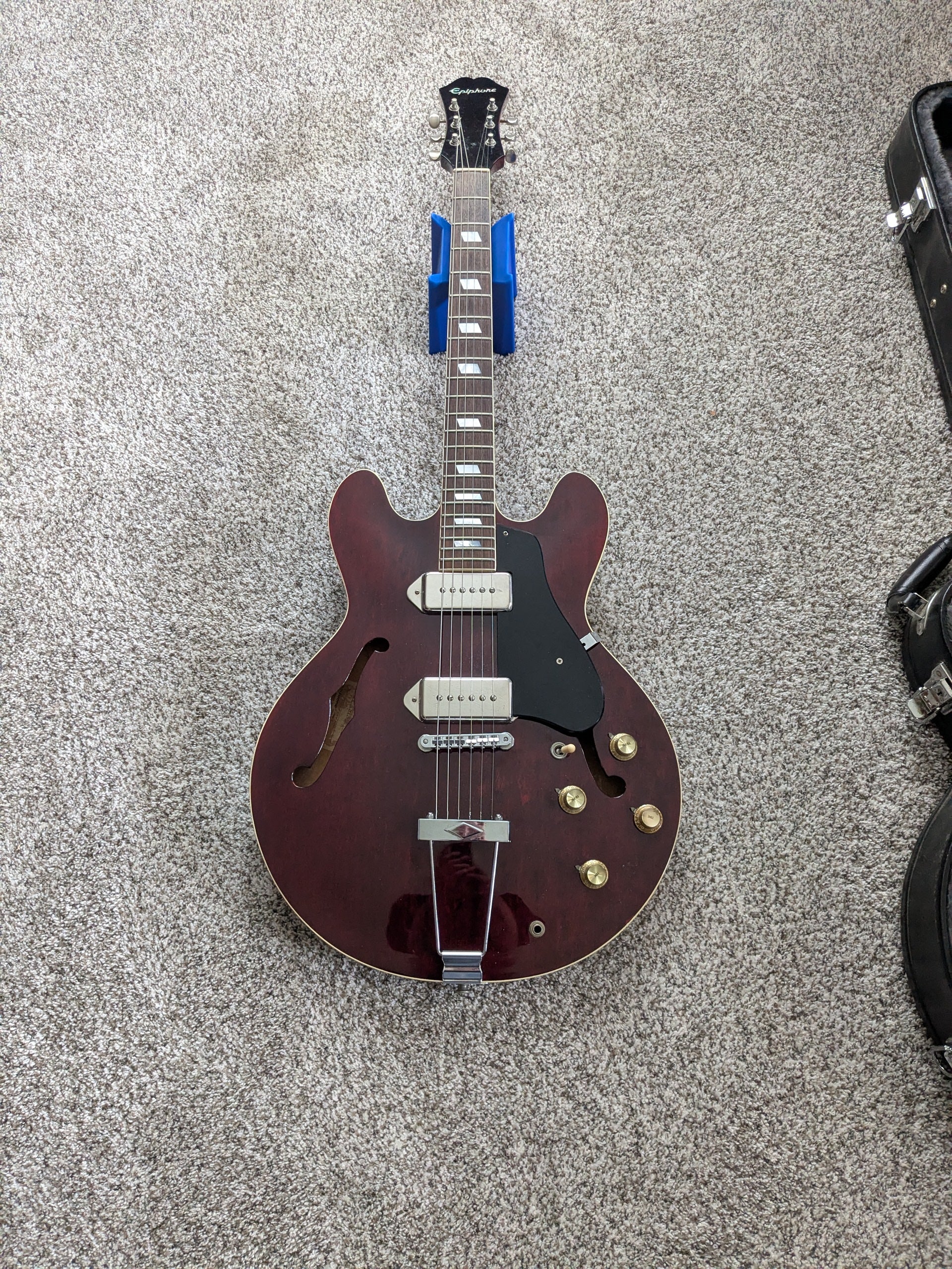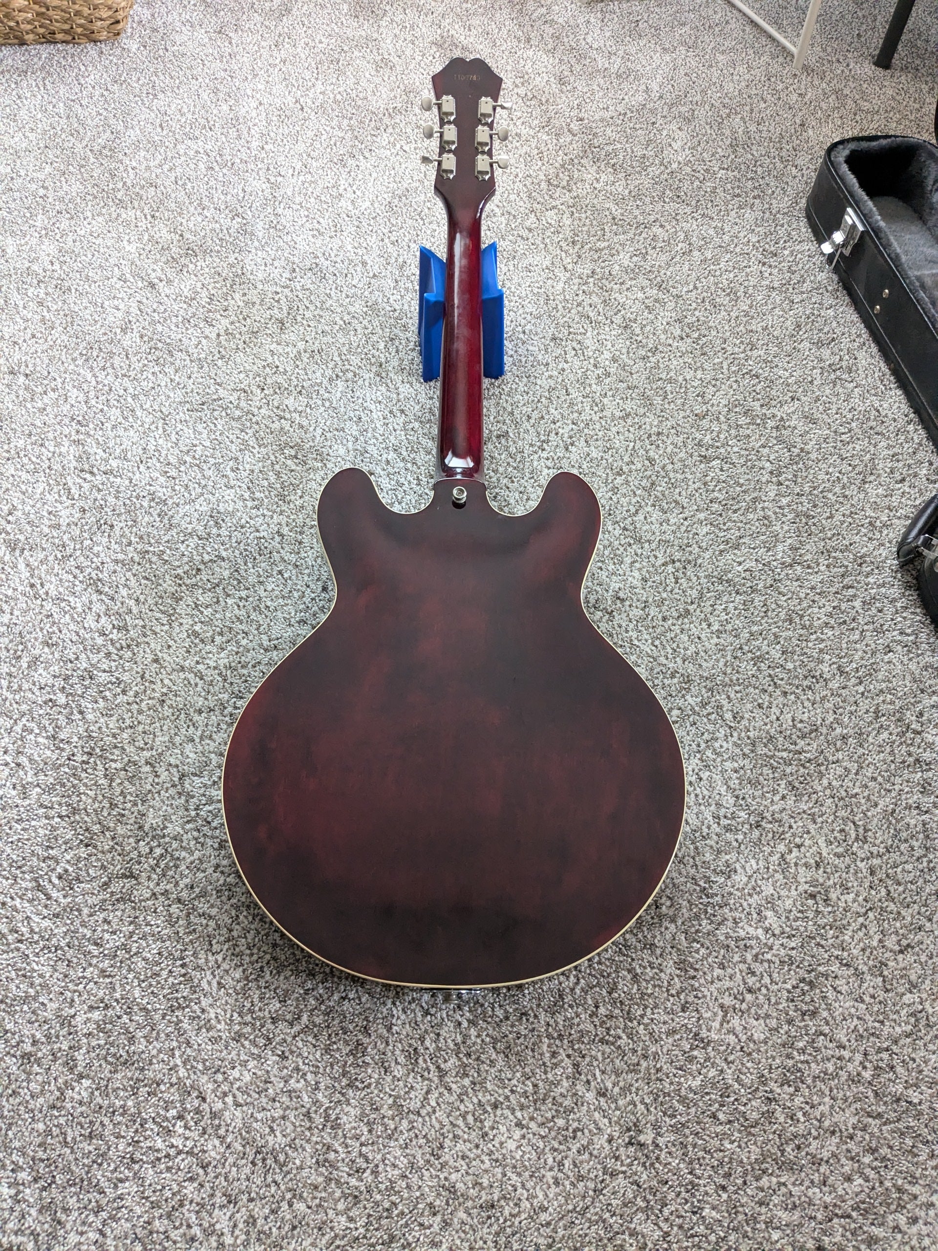 - Classic Casino appointments: trapeze tailpiece, parallelogram inlays, and bound body/neck