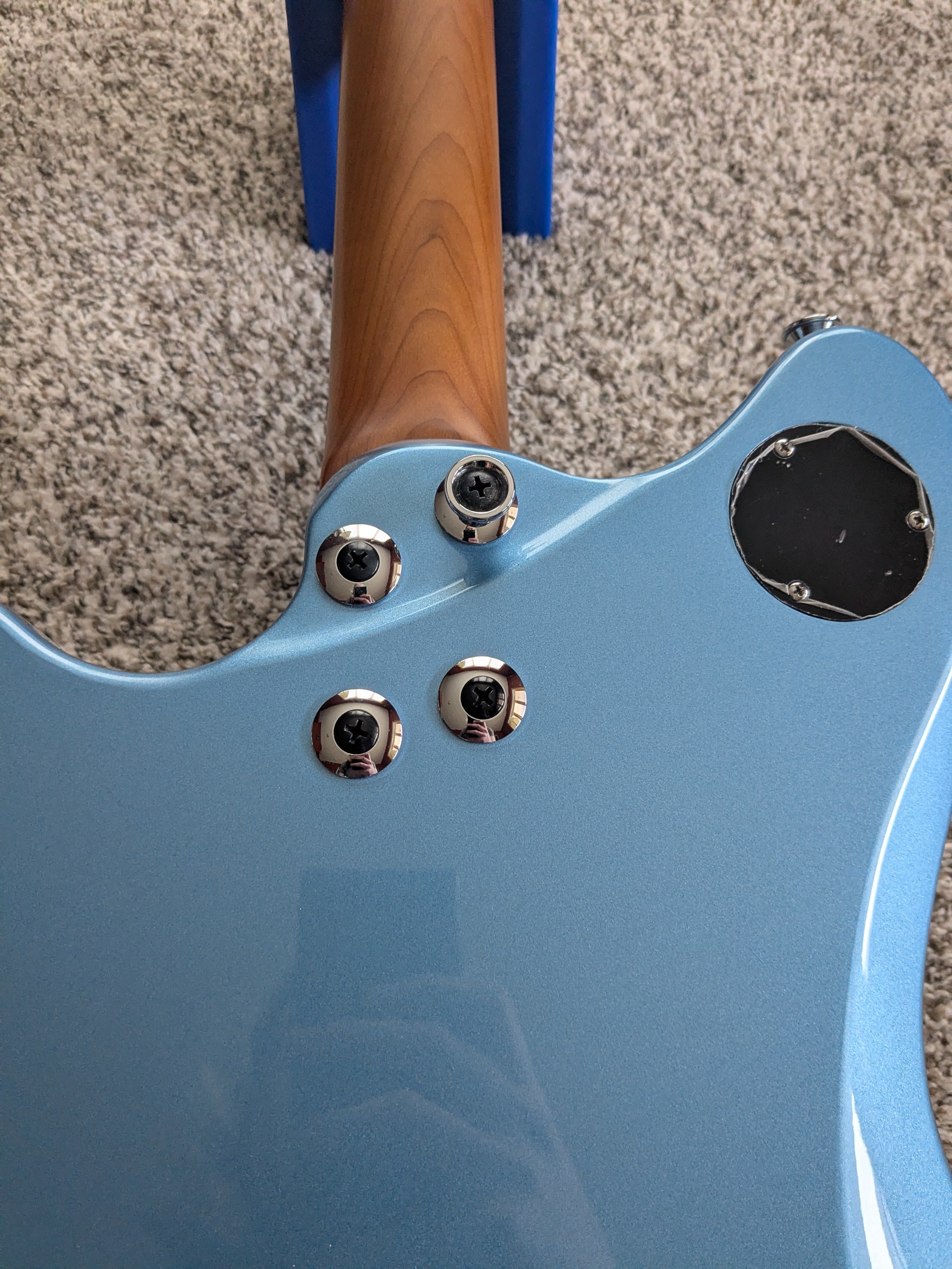 This guitar was refurbished by MIRC (which is why the serial number is reassigned). It is stamped used on the back of the headstock (pictured) to prevent warranty claims. This particular model is overall in excellent condition with no significant flaws of note. It is currently setup with 10s and intonates and plays well. Weight comes in at around 9 lbs 2oz. Also comes with a fender jazzmaster/starcaster gig bag that fits this guitar well.