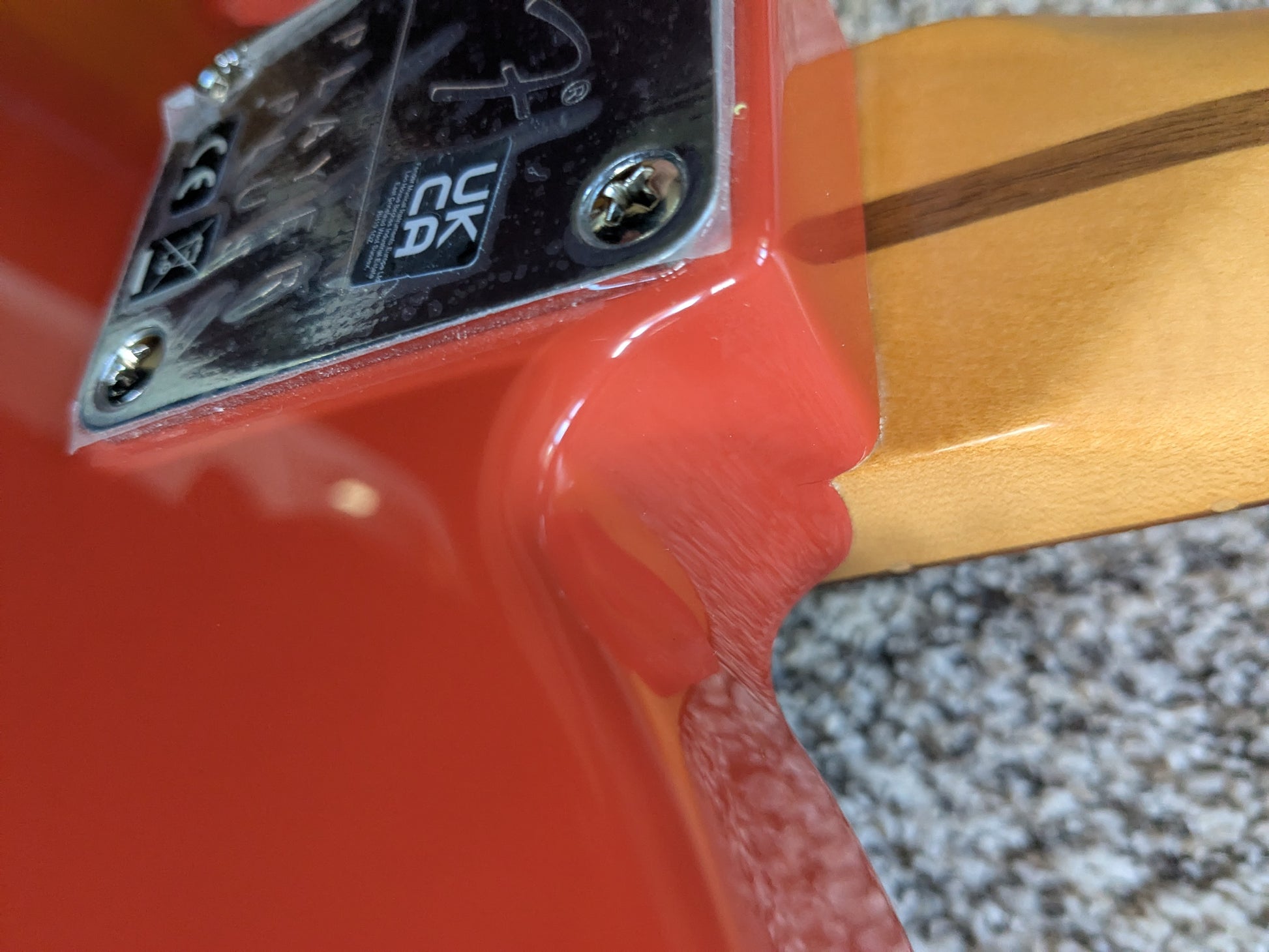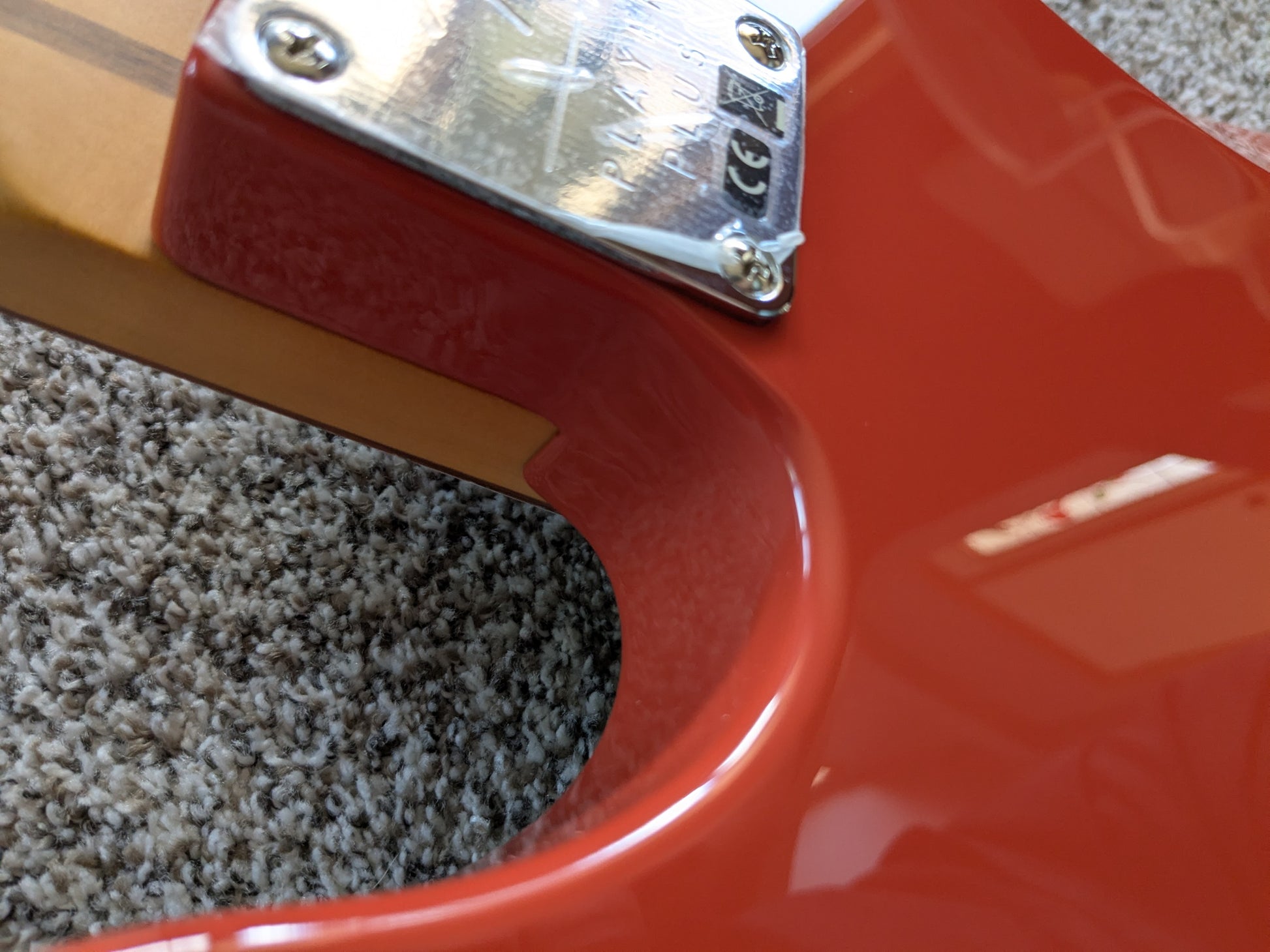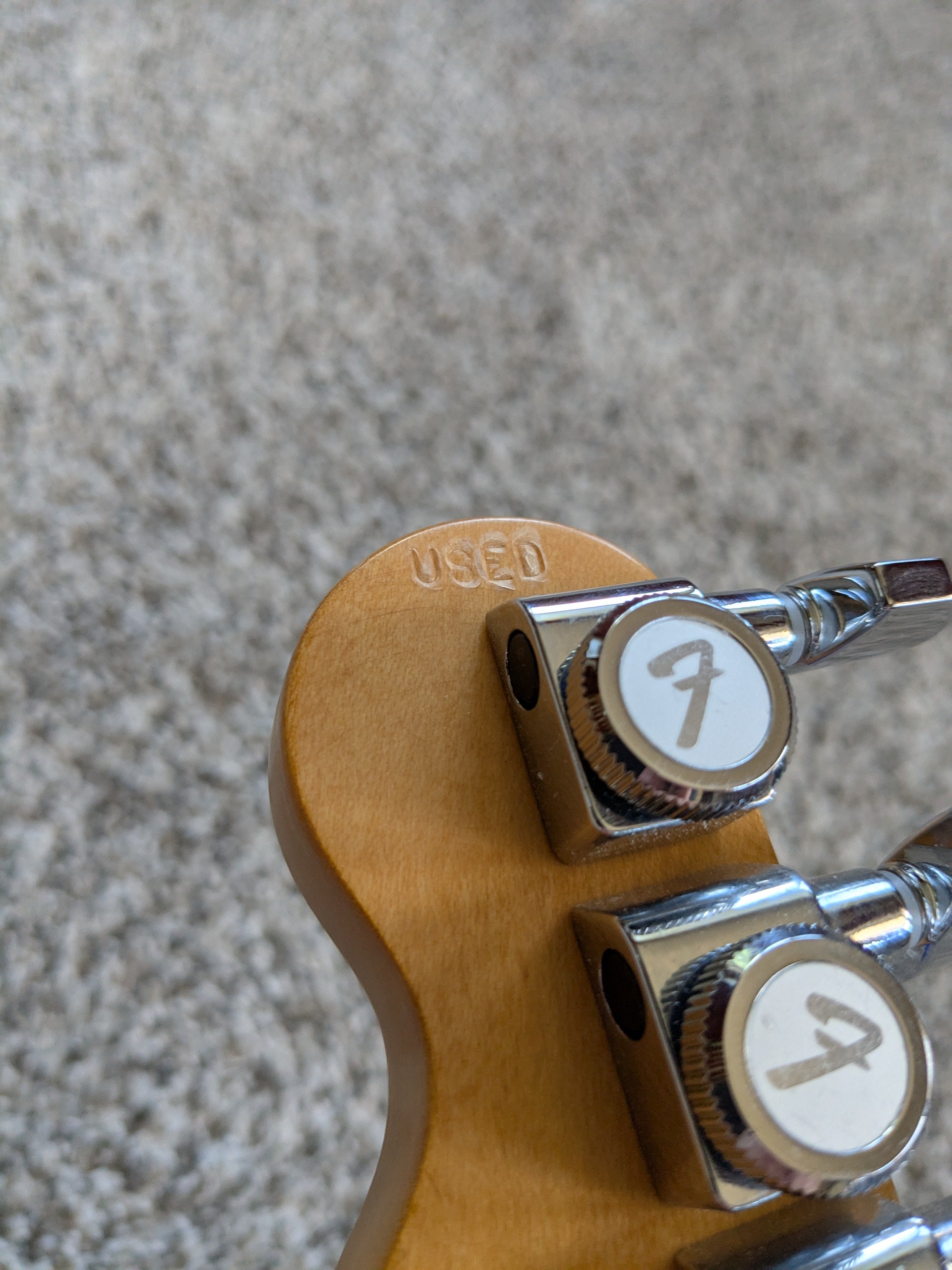 This guitar was refurbished by MIRC (which is why the serial number is reassigned). It is stamped used on the back of the headstock (pictured) to prevent warranty claims. This particular model is in very good condition with the front right repaired finish blemish knocking it from excellent --> very good in my assessment. It is currently setup with 9s and intonates and plays well. Also features a conditioned fretboard and comes with fender gig bag pictured. Weight comes in at around 7lbs 14oz.
