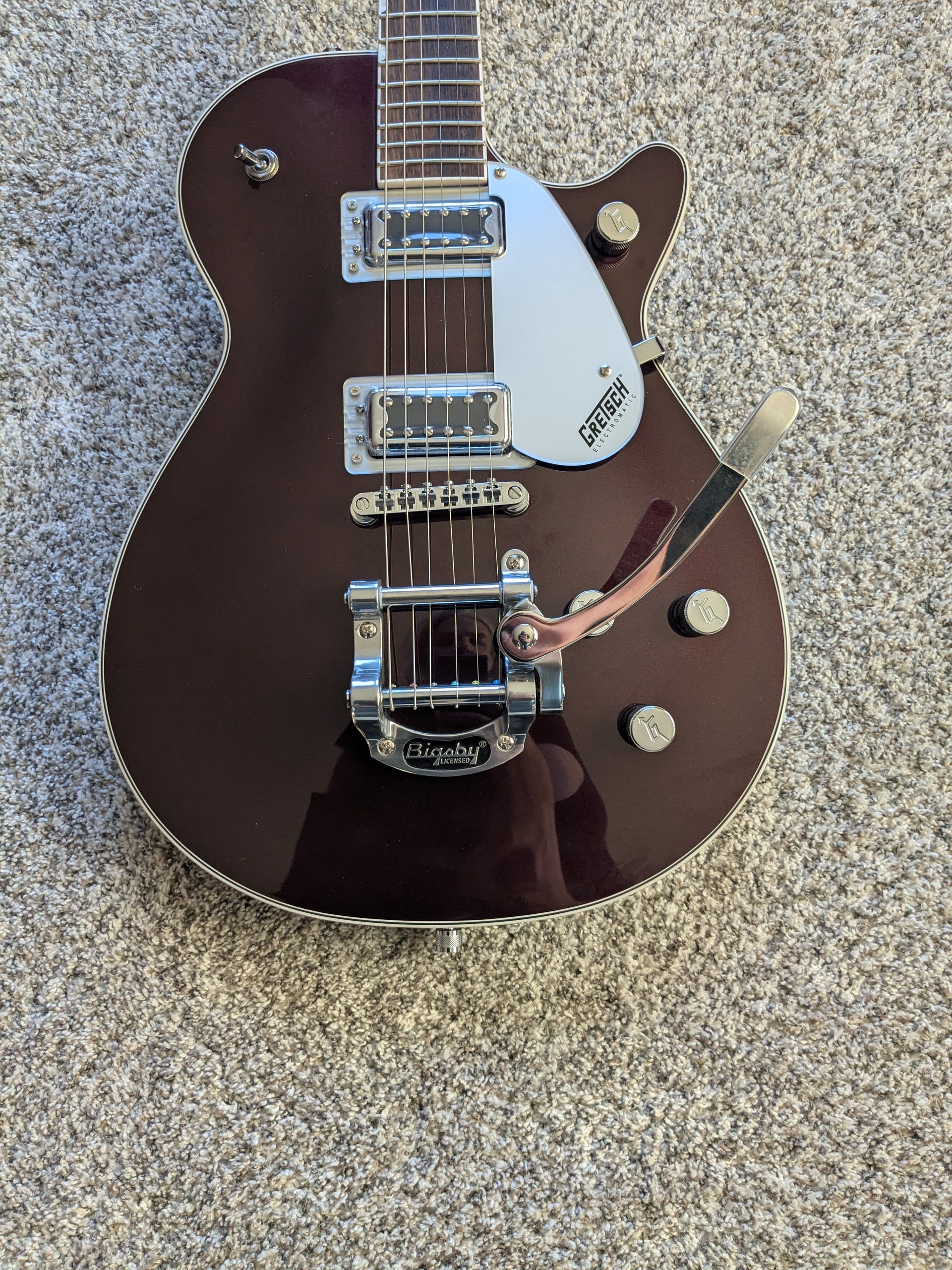 - Hardware: The chrome hardware and Bigsby tailpiece remain bright and clean.