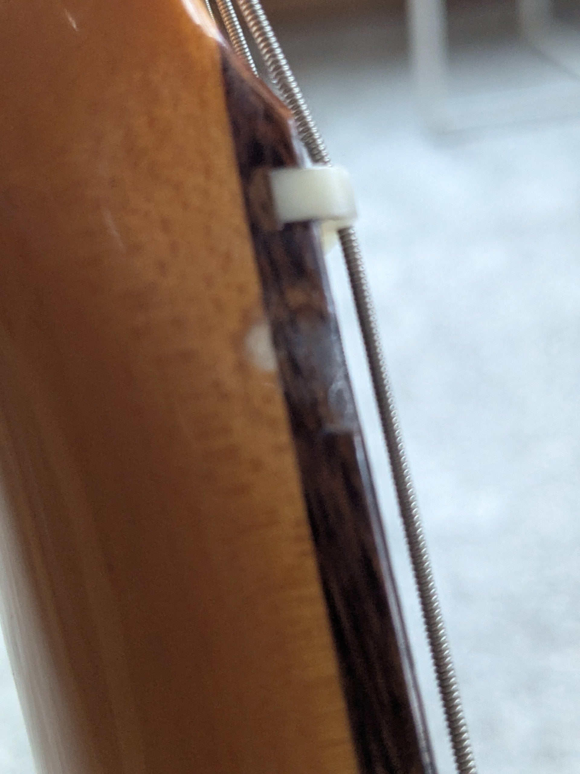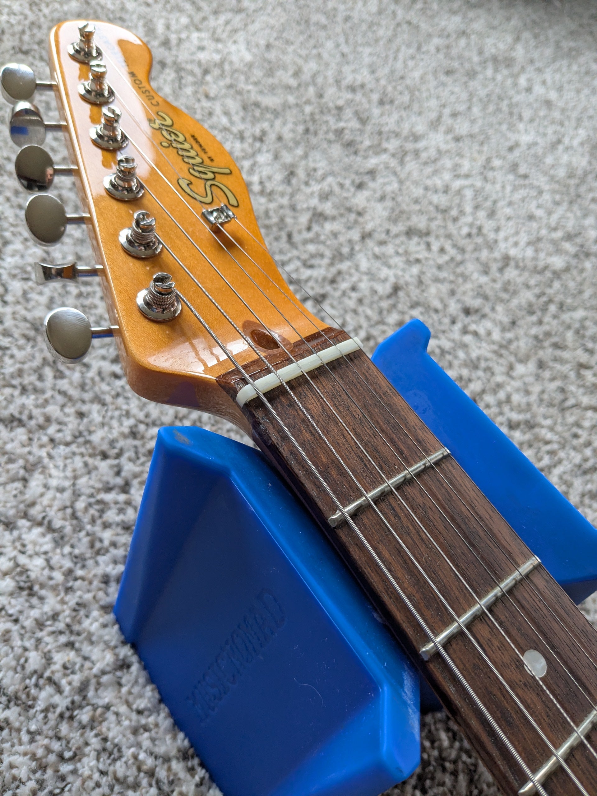 This particular guitar has 1 repaired blemish of note near the nut (pictured). The finish had chipping and this has been drop filled and buffed to prevent further decay. This knocks it from excellent --> very good condition in my assessment. This guitar is currently setup with 9's and has a conditioned fretboard and smooth frets. Intonate's and plays well. Weight comes in at around 7 lbs 1 oz.