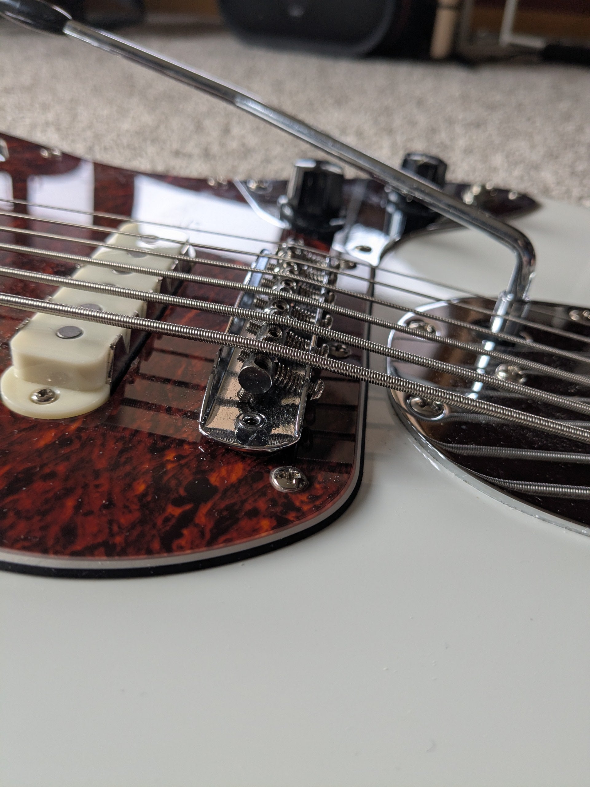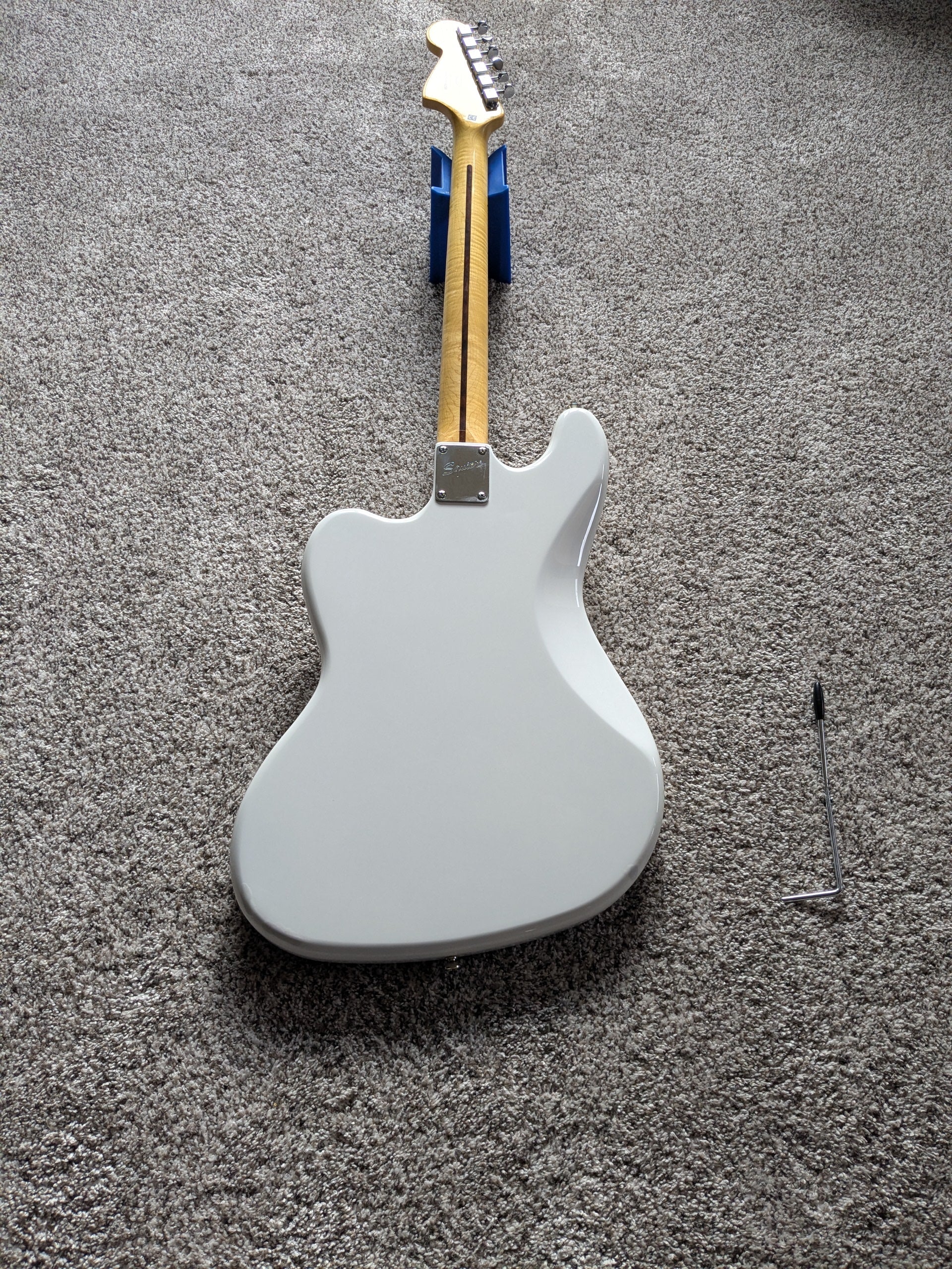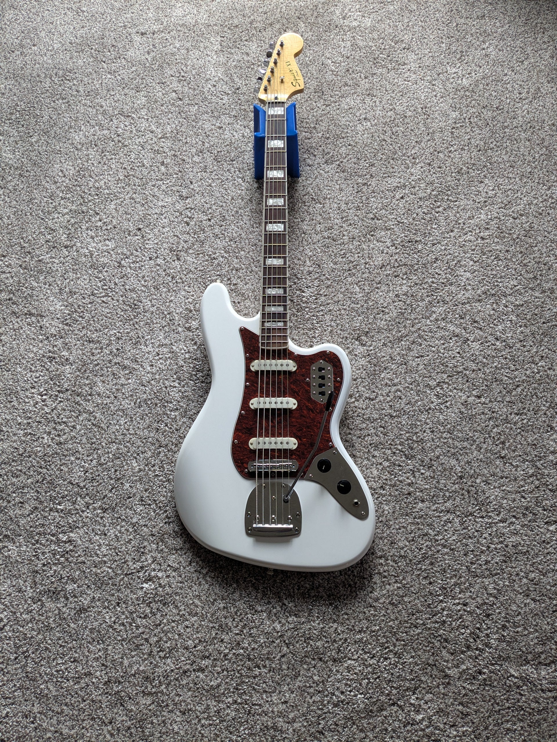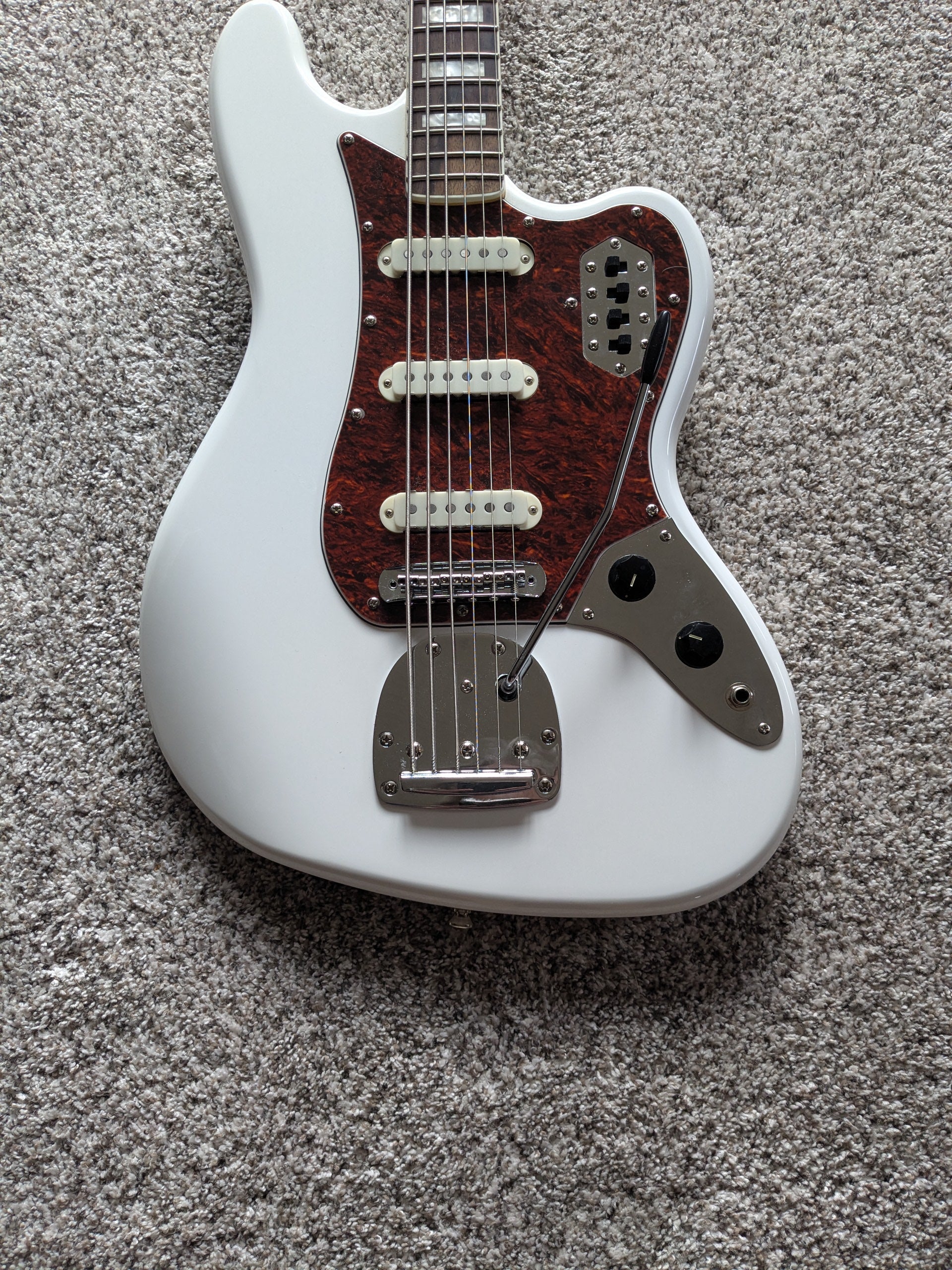 This model has a few finish blemishes (pictured) which knock this from excellent --> good in my assessment. Each spot has been drop filled and buffed to prevent further decay. Intonates and plays really well. Has the upgraded bridge with saddle grooves like the mustang bridge (the vintage modified normally came with the threaded bridge). The difference is the saddle are also individually adjustable, making the guitar easier to intonate. Setup and Tuned E to E (one octave down from regular guitar). Weight comes in at around 9 lbs 7 oz. Includes tremolo arm (pictured).