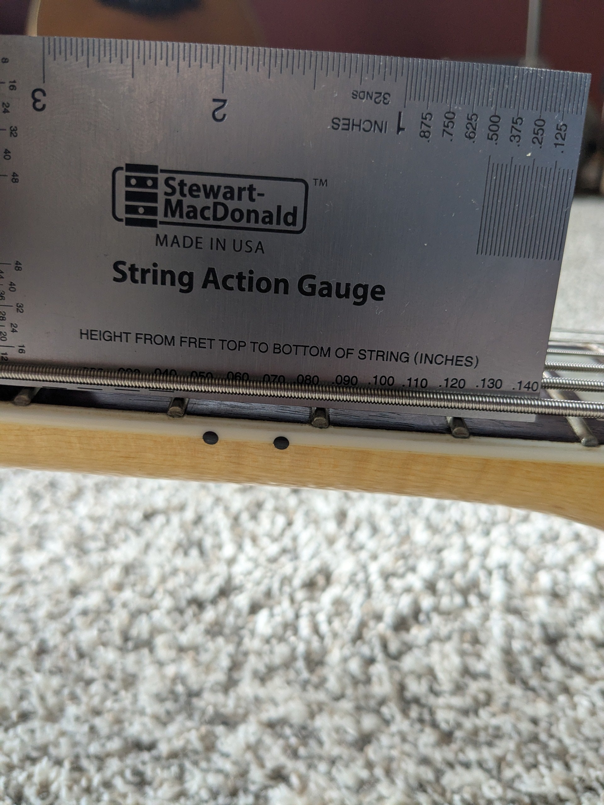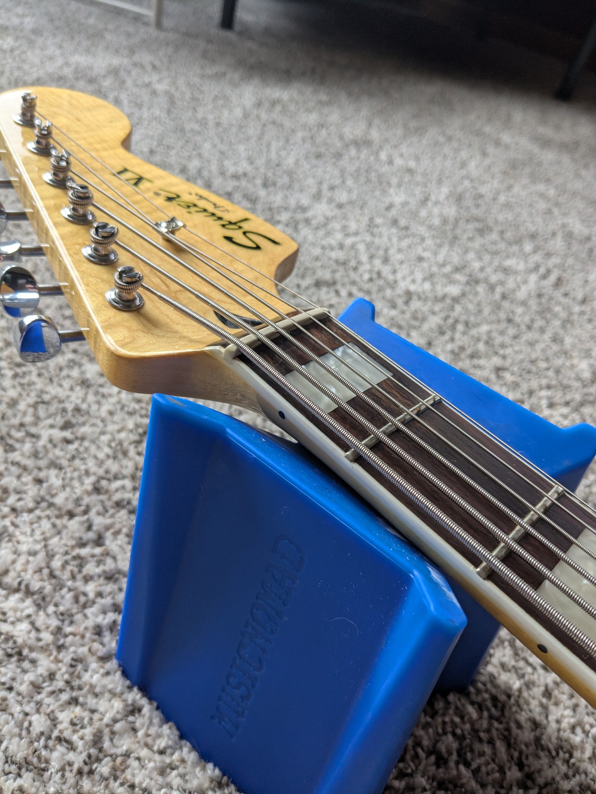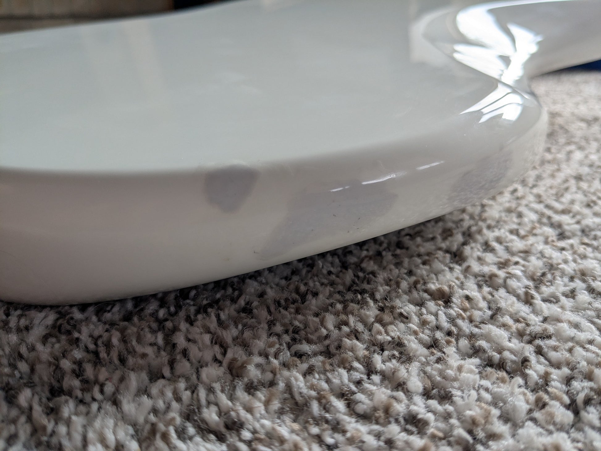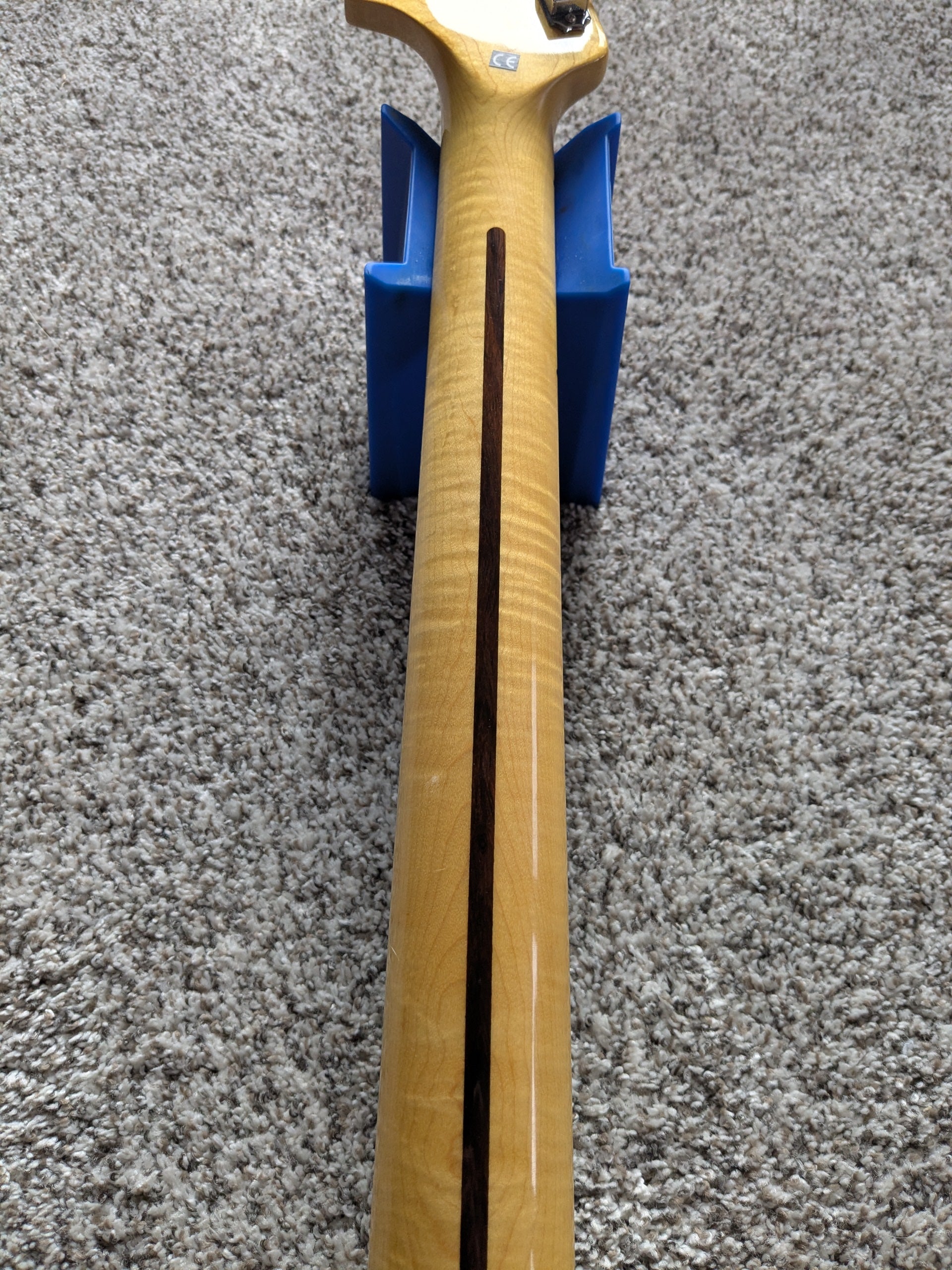 This model has a few finish blemishes (pictured) which knock this from excellent --> good in my assessment. Each spot has been drop filled and buffed to prevent further decay. Intonates and plays really well. Has the upgraded bridge with saddle grooves like the mustang bridge (the vintage modified normally came with the threaded bridge). The difference is the saddle are also individually adjustable, making the guitar easier to intonate. Setup and Tuned E to E (one octave down from regular guitar). Weight comes in at around 9 lbs 7 oz. Includes tremolo arm (pictured).
